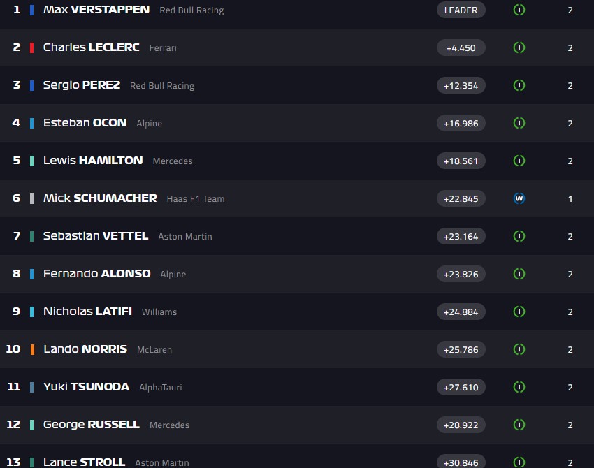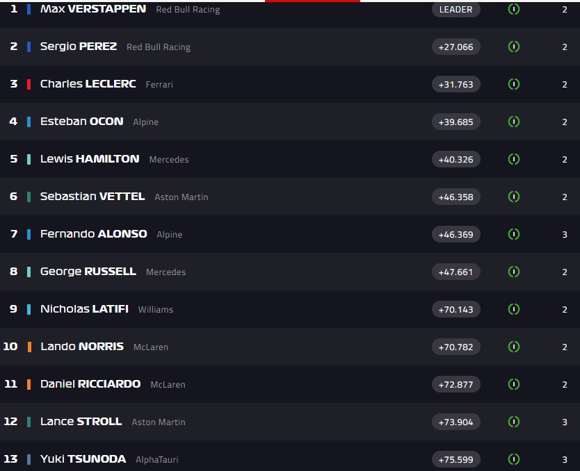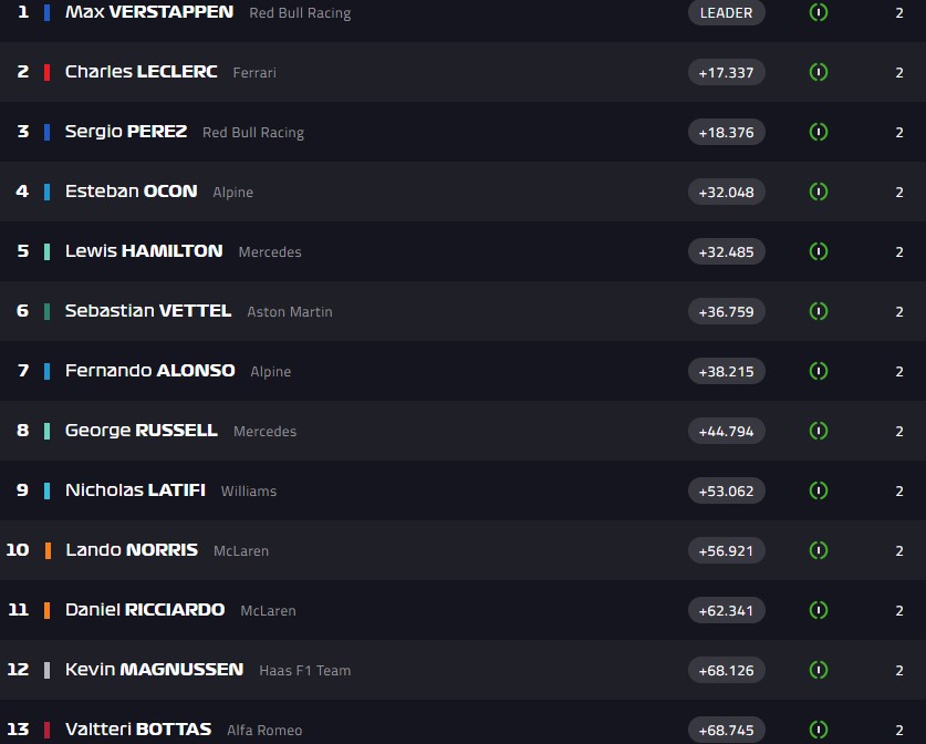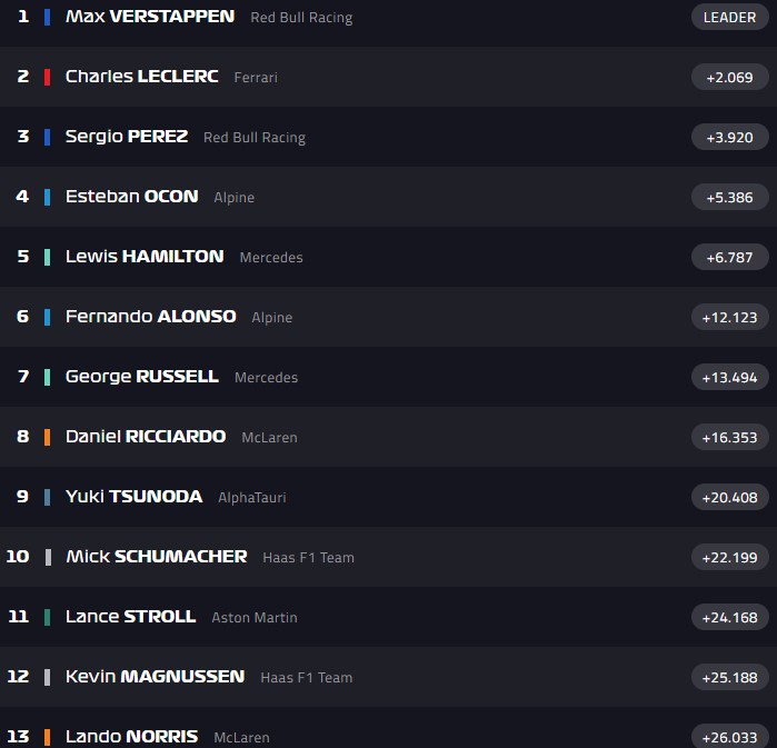 Более 25% гонки пройдено и в очки попадают уже 9 человек. Ферстаппен - 13, Леклер - 10, но у него сейчас лучший круг.