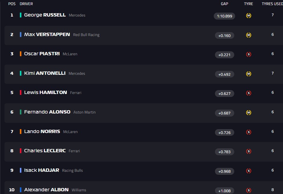 1.10.899 - Рассел забирает поул! Ферстаппен второй, Пиастри - третий.