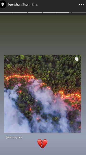 Известный британский автогонщик и шестикратный чемпион Формулы-1 Льюис Хэмилтон опубликовал у себя в сторис инстаграм запись сообщества Karmagawa, на которой изображены лесные пожары в Сибири.
