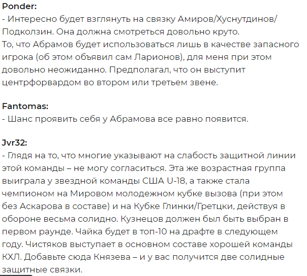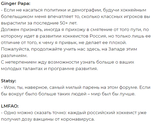 В преддверии чемпионата мира, который в этом году пройдёт в Эдмонтоне, американские поклонники хоккея на страницах популярного форума HF Boards высоко оценили новое поколение российских хоккеистов.