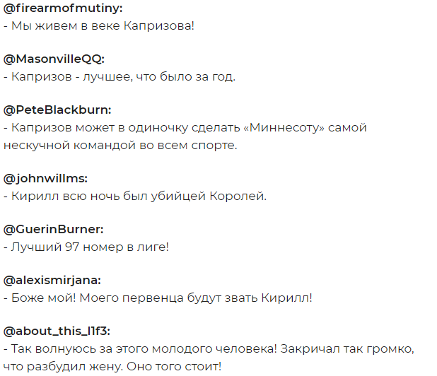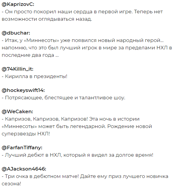 Сразу после матча в зарубежном сегменте Twitter поклонники "Миннесоты" устроили настоящую дискуссию, посвящённую яркому дебюты бывшего армейца в НХЛ.