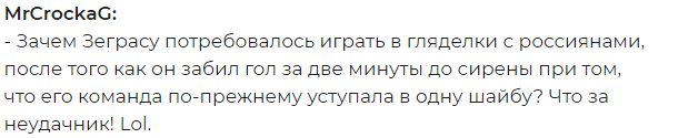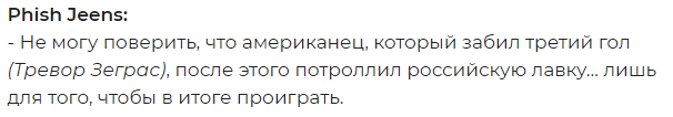По мнению американских болельщиков, выходка Зегарса смотрелась весьма жалко, особенно после того, как Россия ответила на дерзость американца итоговым счётом на табло.