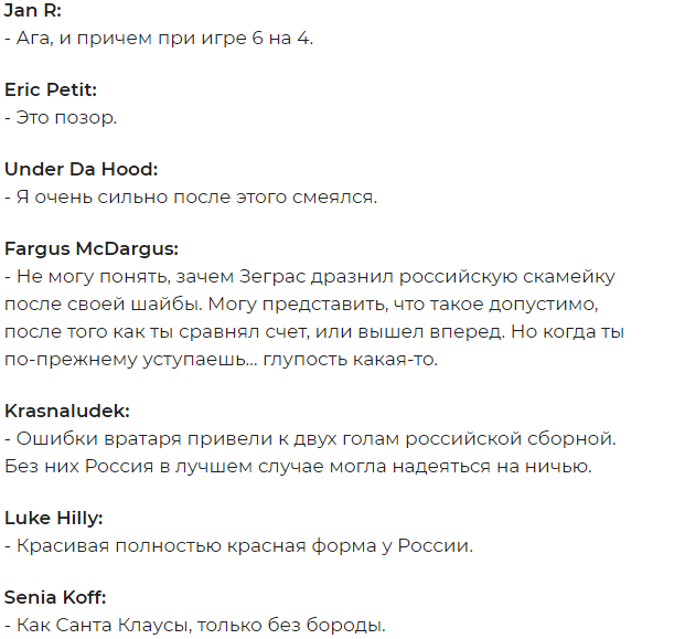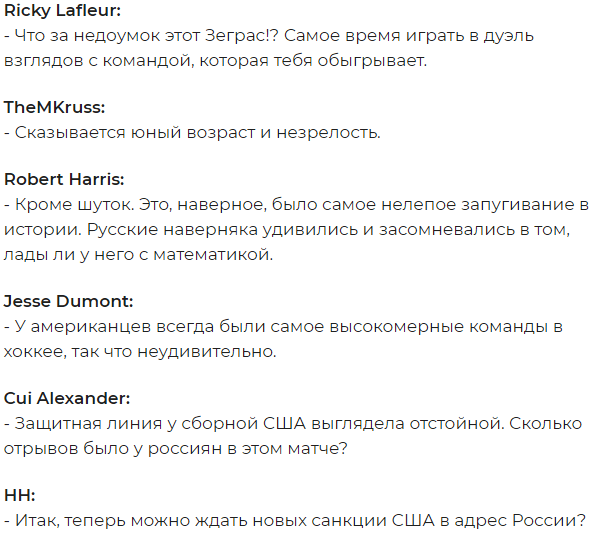 После матча на платформе YouTube болельщики американской команды обсудили поведение форварда своей команды Тревора Зеграса, который стал автором третьей шайбы в ворота россиян.