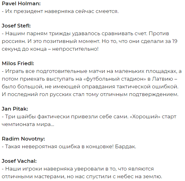 - Такая пощёчина от русских – как раз то, что требовалось нашей команде. Если это наше золотое поколение, парням надо научиться справляться с такими неудачами. Да, уж лучше бы мы проиграли в Праге, а в этом матче одержали победу, но что поделать, ошибки у всех случаются, - написал подписчик под ником Daniel Cvejn.