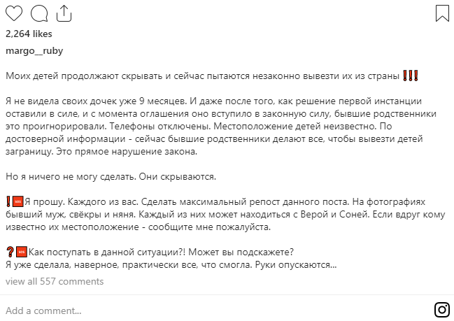 Сегодня Маргарита опубликовала пост в инстаграме, в котором подчёркивает, что не видела своих детей уже более девяти месяцев.