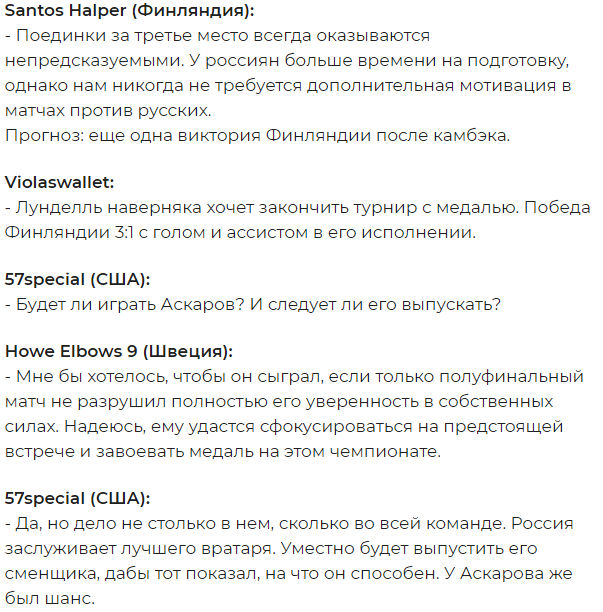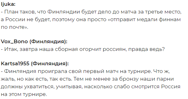 В преддверии бронзового сражения болельщики скандинавской команды на страницах популярного сайта Iltalehti поделились ожиданиями от встречи с "красной машиной".