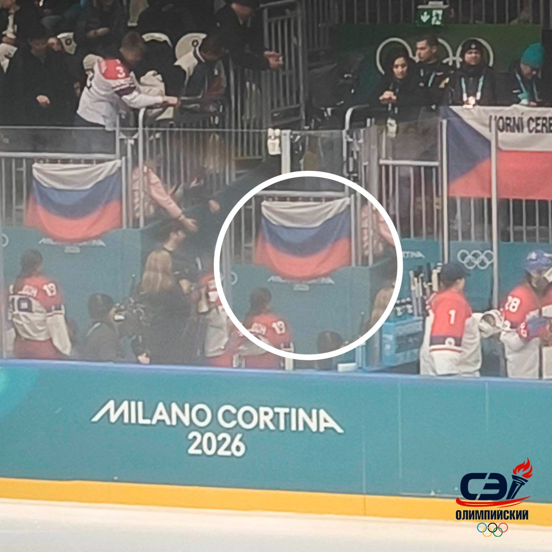 Sport.ru / Хоккей. Во время матча женских хоккейных сборных США и Чехии на Олимпийских играх-2026 болельщики вывесили на трибунах флаг России.