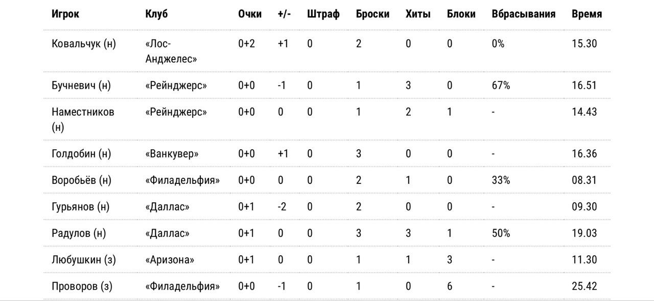 Нападающий Илья Ковальчук отметился двумя результативными передачами. Также на его счету показатель полезности "+1", 2 броска в створ за 15.20 на льду (2.32 – в большинстве). У Павла Бучневича "-1", бросок, 3 силовых приёма за 16.51 на льду (2.06 – в большинстве). У Владислава Наместникова бросок, 2 хита и блок-шот за 14.43 (1.29 – в меньшинстве). На счету защитника Ивана Проворова показатель полезности "-1", бросок в створ и 6 блок-шотов за 25.43 на льду (4.14 – в меньшинстве). У Михаила Воробьёва 2 броска за 8.31. У Николая Голдобина "+1" и 3 броска за 16.36 (3.19 – в большинстве). Нападающий "Далласа" Александр Радулов отметился результативной передачей. Также на его счету 3 броска в створ, 3 силовых приёма и блок-шот за 19.03 на льду (2.39 – в большинстве) У Дениса Гурьянова также передача. Кроме того, у него показатель полезности "-2" и 2 броска за 9.30 (1.59 – в большинстве). Передачей отметился и защитник "Аризоны" Илья Любушкин.