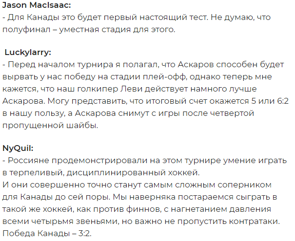 Sport.ru/ Хоккей. В преддверии полуфинального сражения между сборными России и Канады болельщики "кленовых" на страницах популярного форума Hfboards поделились ожиданиями от предстоящей баталии.
