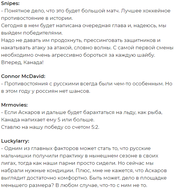 Заокеанские поклонники самой быстрой игры в мире сошлись во мнении, что сегодняшний матч является продолжением исторического противостояния с Россией, а потому канадцы должны непременно побеждать.