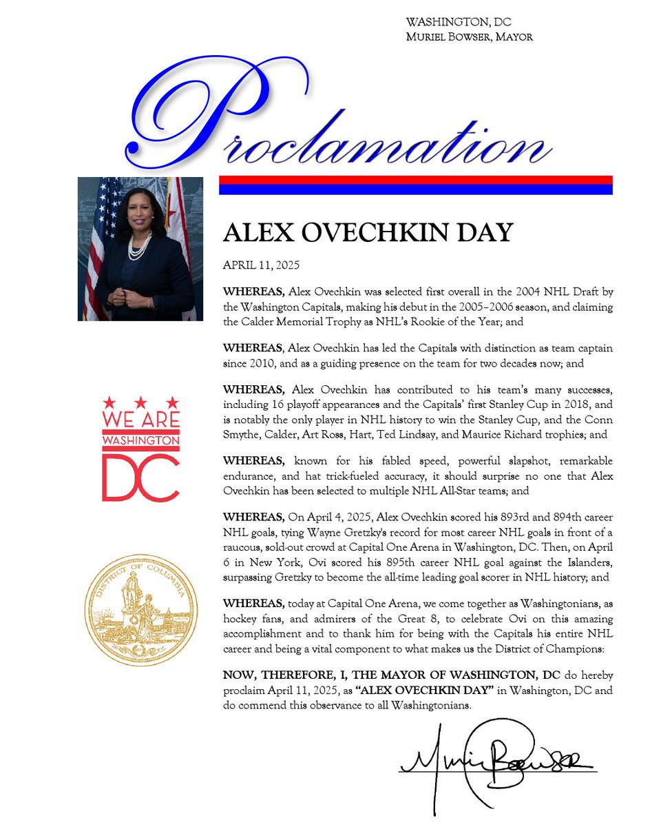 Мэр Вашингтона провозгласила 11 апреля 2025 года "Днём Александра Овечкина"