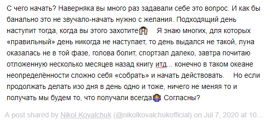 На этот раз Николь Ковальчук опубликовала мотивирующий пост, цель которого, заставить людей взять собственную судьбу в свои руки, вместо того, чтобы провести всю жизнь в "зрительном зале".