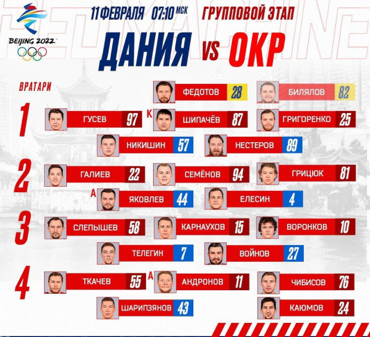 Приветствуем вас, уважаемые любители хоккея! Предлагаем вашему вниманию прямую текстовую онлайн трансляцию матча группового этапа на Олимпийских играх в Пекине, в котором встретятся мужские сборные России и Дании. Поединок начнётся 11 февраля в 7:10 по московскому времени, а вашим комментатором буду я, Александр Никитин