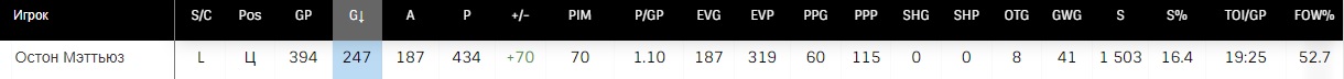 Ну и, наконец, почему за шесть сезонов? А потому-что для того чтобы проследить динамику, мы возьмем за ориентир статистику самого молодого из этой пятерки - Остона Мэтьюза, который в данный момент проводит свой шестой сезон в Национальной Хоккейной Лиге. Наравне с этим, важно и то, что шесть лет - это не год и не два, и тут уже вполне уместно говорить о некой стабильности хоккеиста. Поэтому, с остальными голеадорами мы поступим так же - сравним их статистику за первые шесть сезонов, которые они провели в НХЛ. Мы делим количество сыгранных ими матчей на количество голов и высчитываем средний коэффициент заброшенных шайб. Чем ниже коэффициент, тем лучше динамика. Поехали: