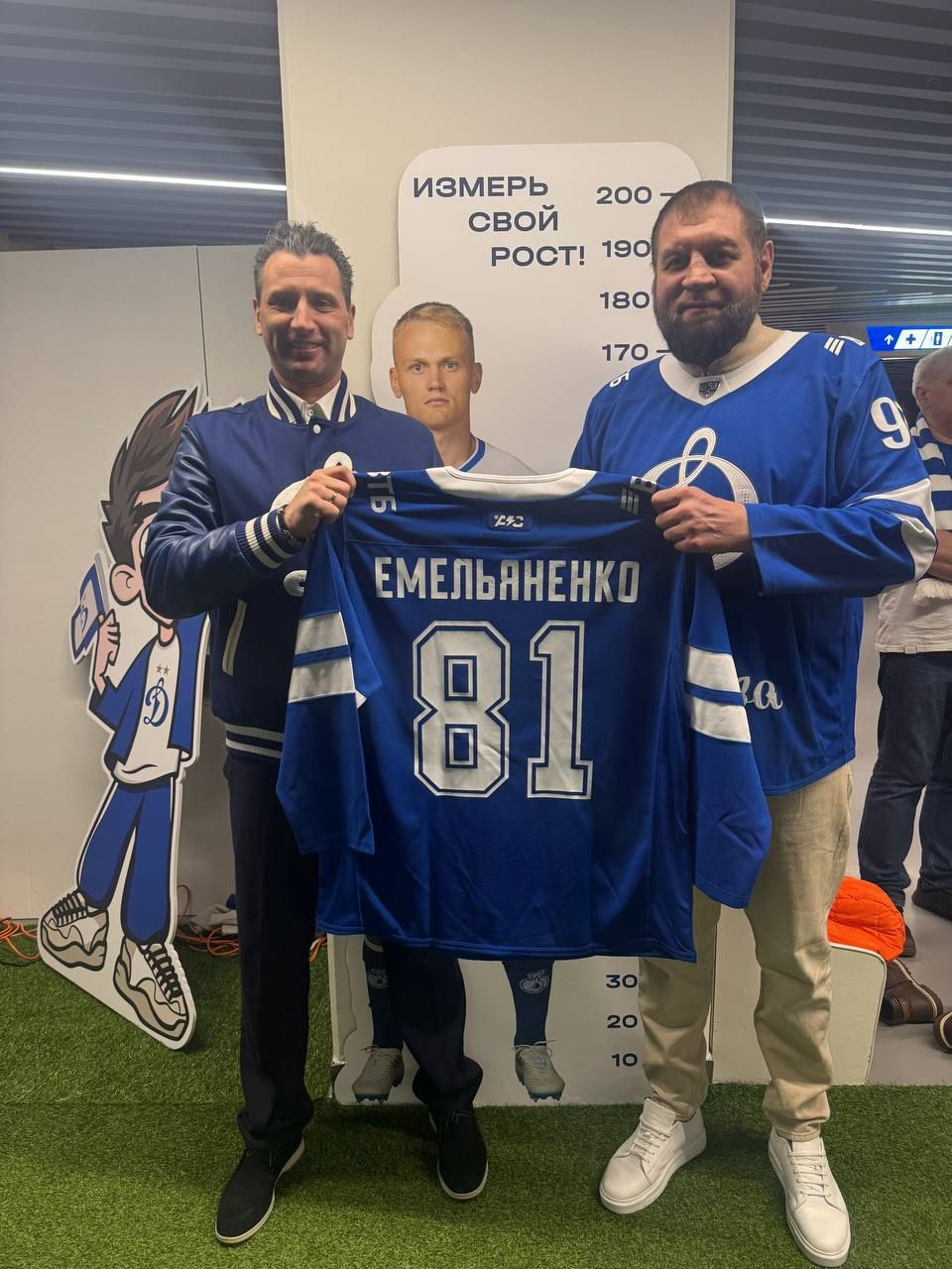 Sport.ru / Хоккей. Главный тренер сборной "Россия 25" и член совета директоров московского "Динамо" Роман Ротенберг поделился фотографией, на которой позирует вместе со звёздным бойцом ММА Александром Емельяненко на фоне картонной фигуры нападающего "Динамо" Константина Тюкавина.