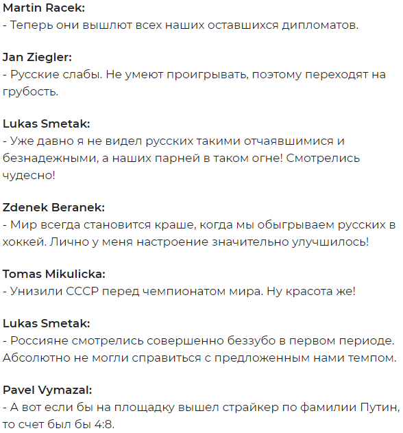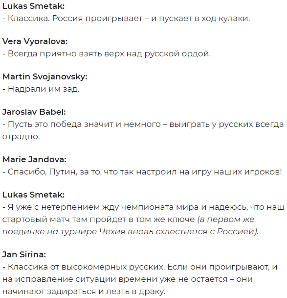 России досталось от чешских болельщиков по полной программе: местные фанаты обвинили "красную машину" в безвольности и не умение проигрывать. Также отличились и местный СМИ.