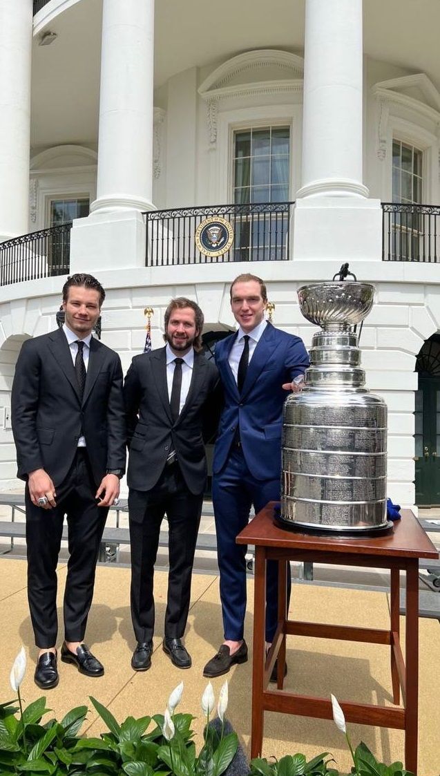 Sport.ru / Хоккей Российский защитник "Тампы" Михаил Сергачёв опубликовал фото с партнёрами по команде - голкипером Андреем Василевским и форвардом Никитой Кучеровым - а также с Кубком Стэнли перед встречей с президентом США Джо Байденом в Белом доме.