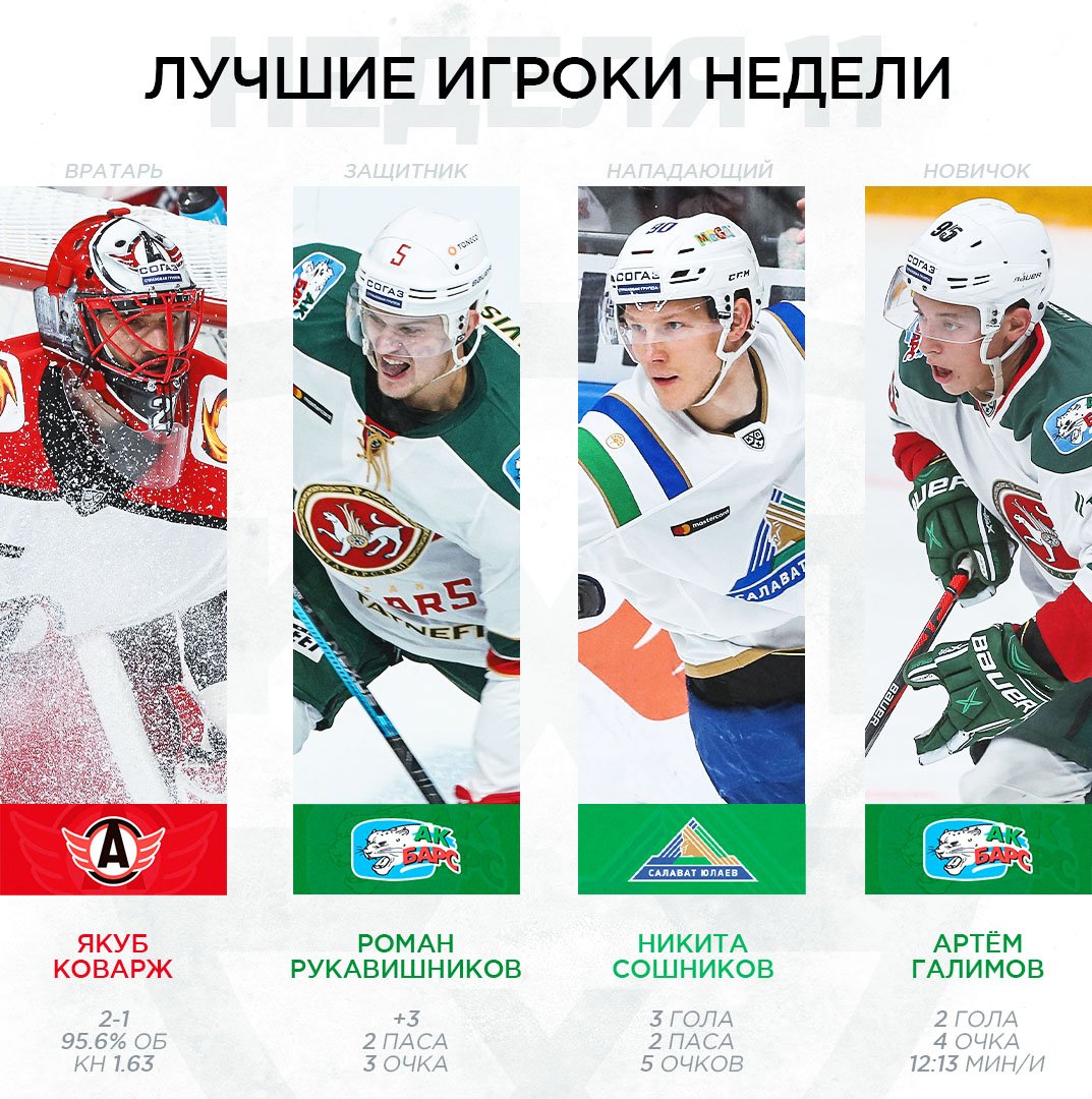 Форвард "Салавата Юлаева" Никита Сошников стал лучшим нападающим недели, на его счету 5 (3+2) очков в четырёх играх недели.