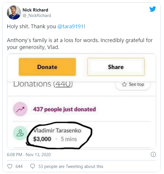 Sport.ru/ Хоккей. В пятницу, 13-го ноября, стало известно, что форвард заокеанского "Сент-Луиса" Владимир Тарасенко решил помочь юному поклоннику хоккея Энтони Макдональду.
