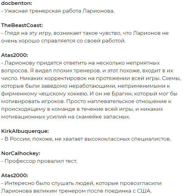 По мнению заокеанских фанатов, главный тренер россиян Игорь Ларионов допустил ряд тактических ошибок, которые и стали причиной поражения России минувшей ночью.