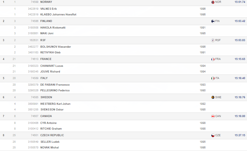 Большунов передал эстафету первым с большим отрывом от норвежца Эрика Вальнеса, однако Йоханнес Клебо быстро догнал Глеба Ретивых, а затем ушёл в отрыв. Ретивых же проиграл и борьбу за серебро финскому лыжнику Йони Мяки. В итоге России досталась бронзовая медаль.