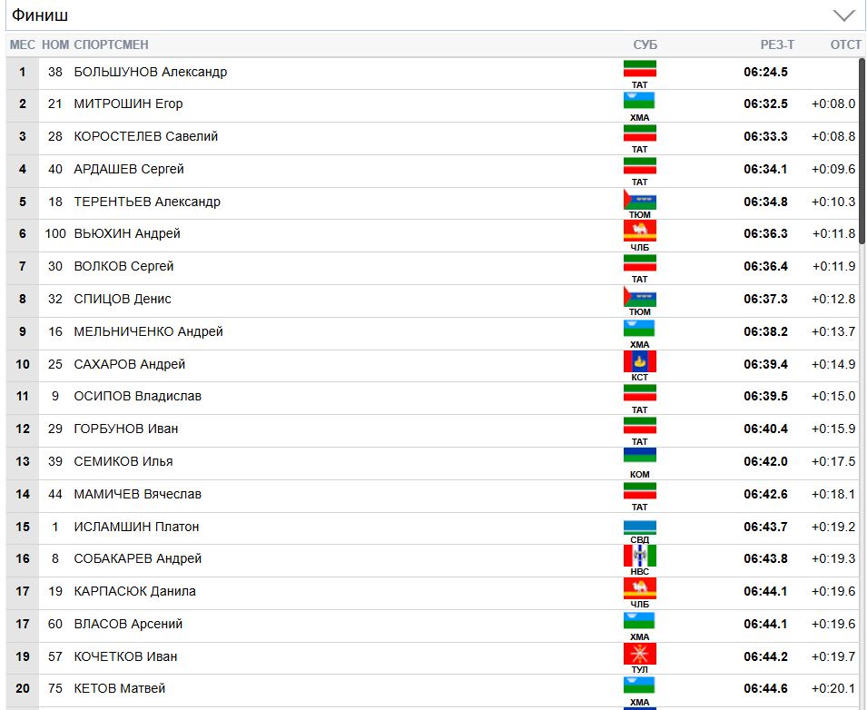 Второе место занял Егор Митрошин, уступивший лидеру 8 секунд. Третьим финишировал Савелий Коростелёв с отставанием 8,8 секунды.