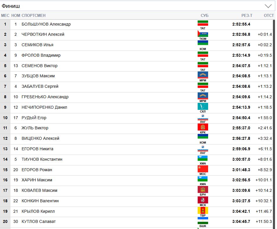 Вторым к финишу пришёл Алексей Червоткин (отставание — 1,4 секунды), третьим стал Илья Семиков (+2,2).