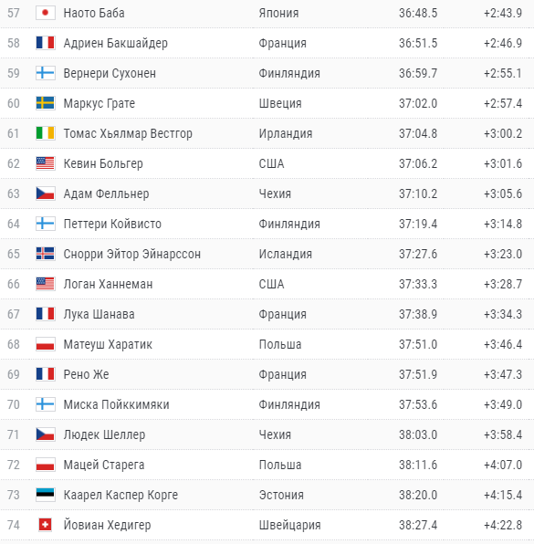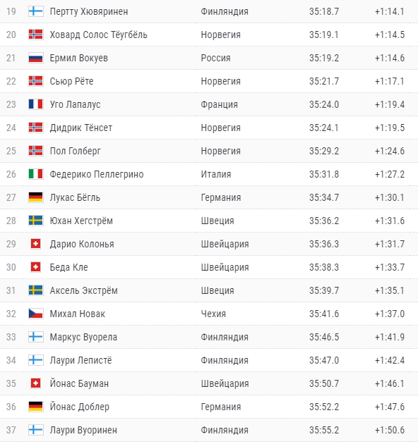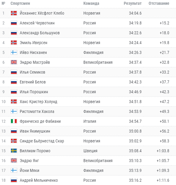 Лучший результат в Руке показал лидер сборной Норвегии Йоханнес Хёсфлот Клебо, показавший результат - 34:04.6.