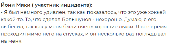 Напомним, что на финишной прямой лыжник из России несколько раз ударил палкой представителя сборной Финляндии Йони Мяки, который перекрыл Александру свободный коридор.