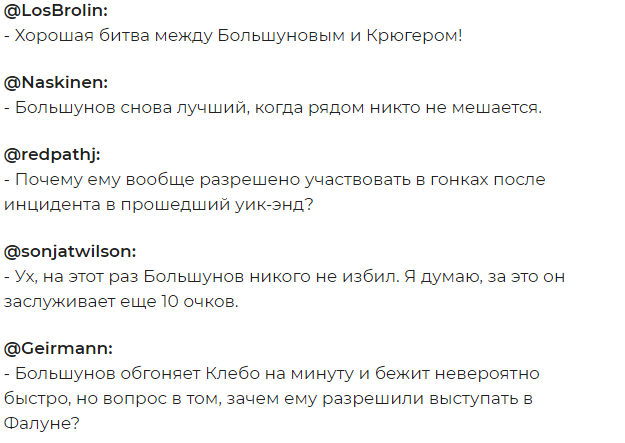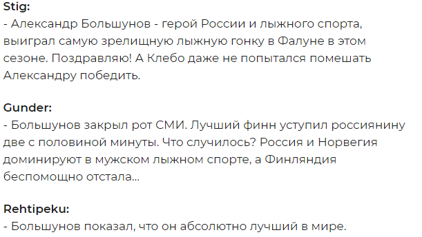 Сразу после забега в Фалуне в зарубежном сегменте Twitter англоязычные поклонники зимних видов спорта оставили множество комментариев, отдав должное таланту лыжника из России.