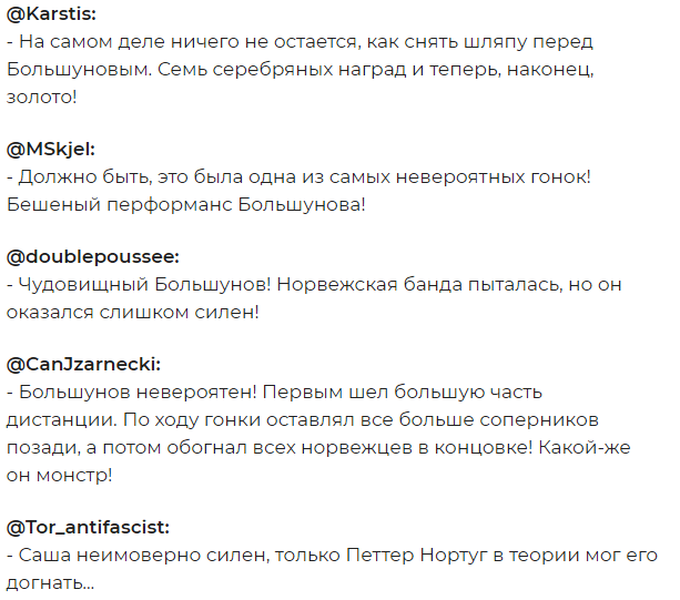 Сразу после гонки в Германии зарубежные поклонники лыжных видов спорта в западном сегменте Twitter устроили настоящую дискуссию, посвящённую успеху лыжника из России.