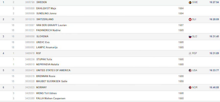 Россиянки заняли в финальном забеге 4-е место, проиграв в борьбе за бронзу сборной Словении. Золото завоевала сборная Швеции. Серебро - у Швейцарии.