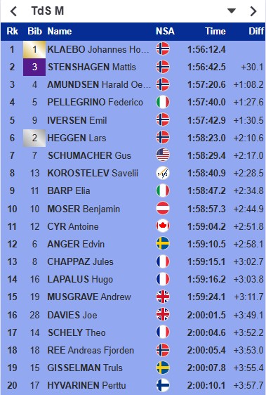 Второе место в общем зачёте у победителя финального подъёма норвежца Маттиса Стенсхагена. Третьим стал ещё один норвежец Харальд Амундсен, который в последней гонке занял 5-е место. В топ-5 вошли также итальянец Федерико Пеллегрино и норвежец Эмиль Иверсен. Россиянин Савелий Коростелёв занял 8-е место.