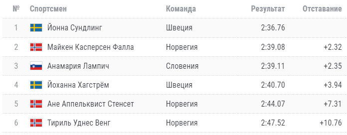 Женскую финальную шестёрку составили три норвежки (Фалла, Стенсет и Венг), две шведки (Сундлинг и Хагстрём) и словенка Лампич. Борьбы в этом забеге не вышло – Йонна Сундлинг держалась во главе группы с самого начала, а на последнем спуске смогла прибавить настолько, что финишировала первой с большим запасом. А вот за серебро шла отчаянная борьба, и судьбу двух оставшихся комплектов наград определил лишь фотофиниш. В итоге второй всё-таки стала норвежка Майкен Фалла, сумевшая опередить Анамарию Лампич на три сотых секунды.