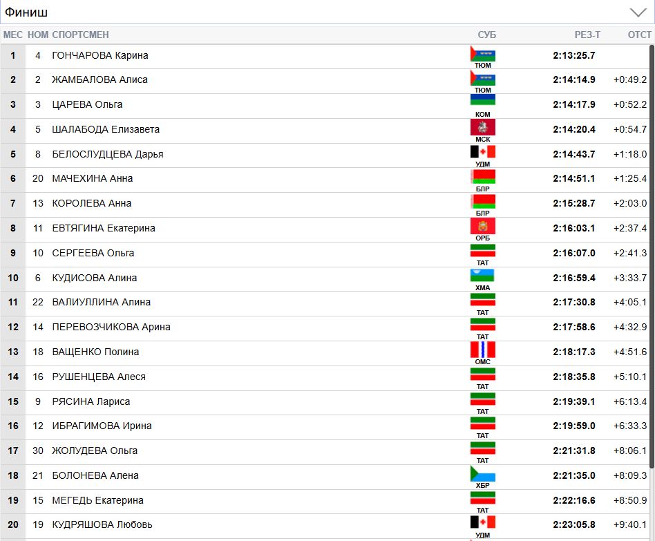 Гончарова прошла дистанцию за 2 часа 13 минут 25,7 секунды. Второе место заняла Алиса Жамбалова (+49,2 секунды). Третьей финишировала Ольга Царёва (+52,2).