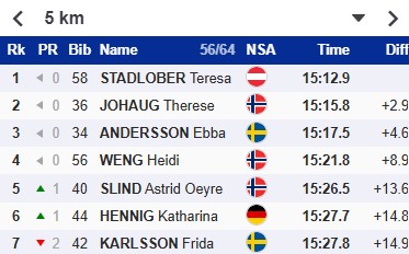 А вот и небольшая сенсация у нас. Австрийка Тереза Штадлобер опережает Йохауг на отсечке 4.2 км.