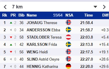 Фрида Карлссон поднимается на 2-е место, отставание от Йохауг - 3 секунды.