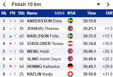 Карлссон отстаёт от Андерссон на 13 секунд, Слинд - на 20.