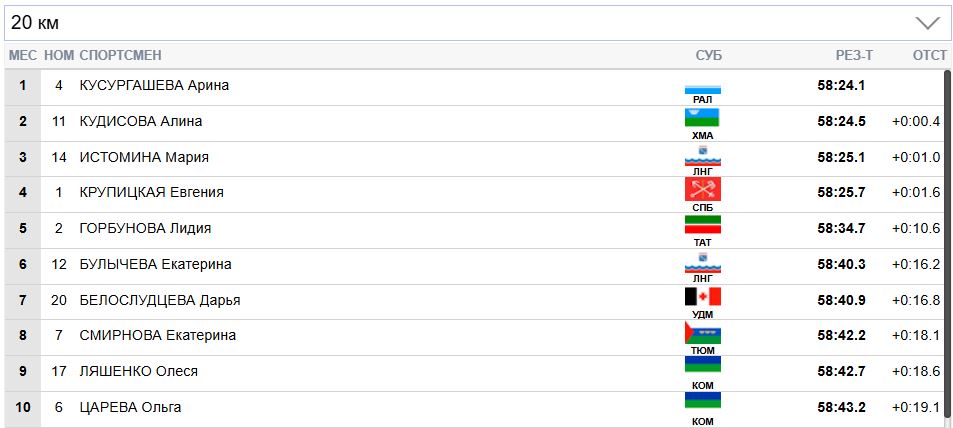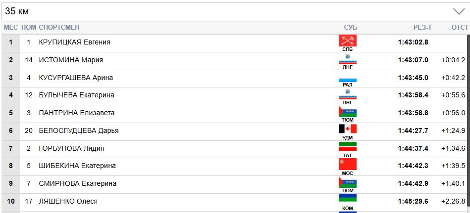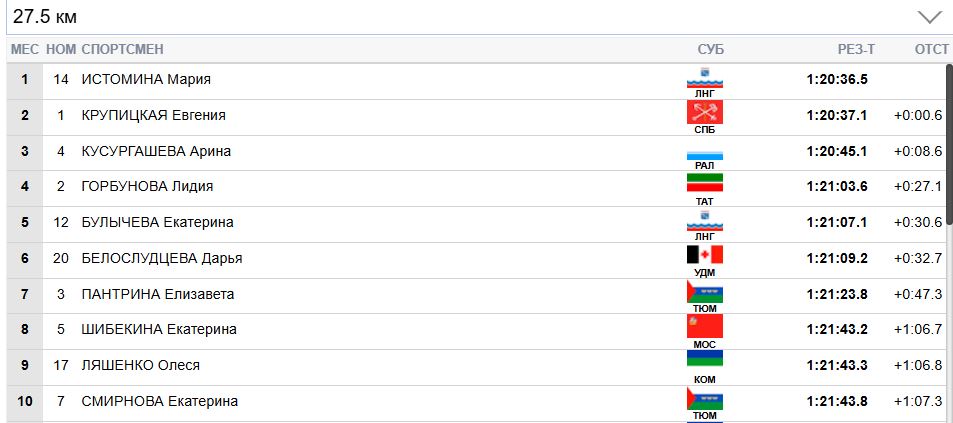 И Крупицкая уже даже отрывается от Истоминой на 4 секунды. А Кусургашева может потерять бронзу.