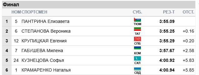У Фалеевой 6-е время на отсечке 700 метров, у Барановой - 8-е, а у Крупицкой - 10-е.