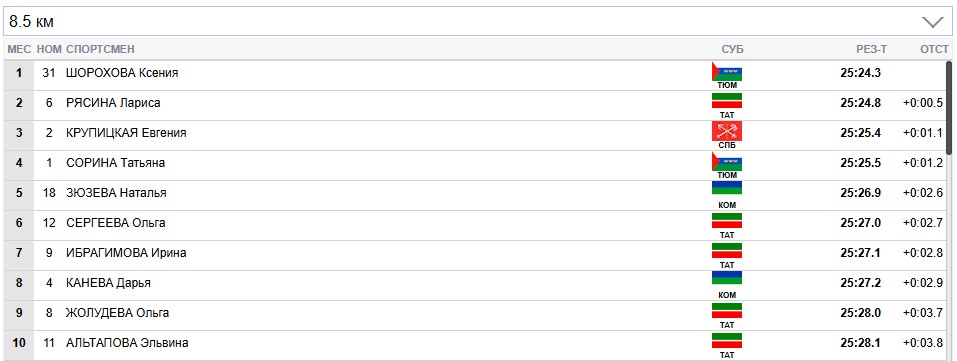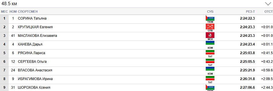 Отрывается Сорина от Маслаковой и Каневой на 2 секунды, от Крупицкой - на 4.