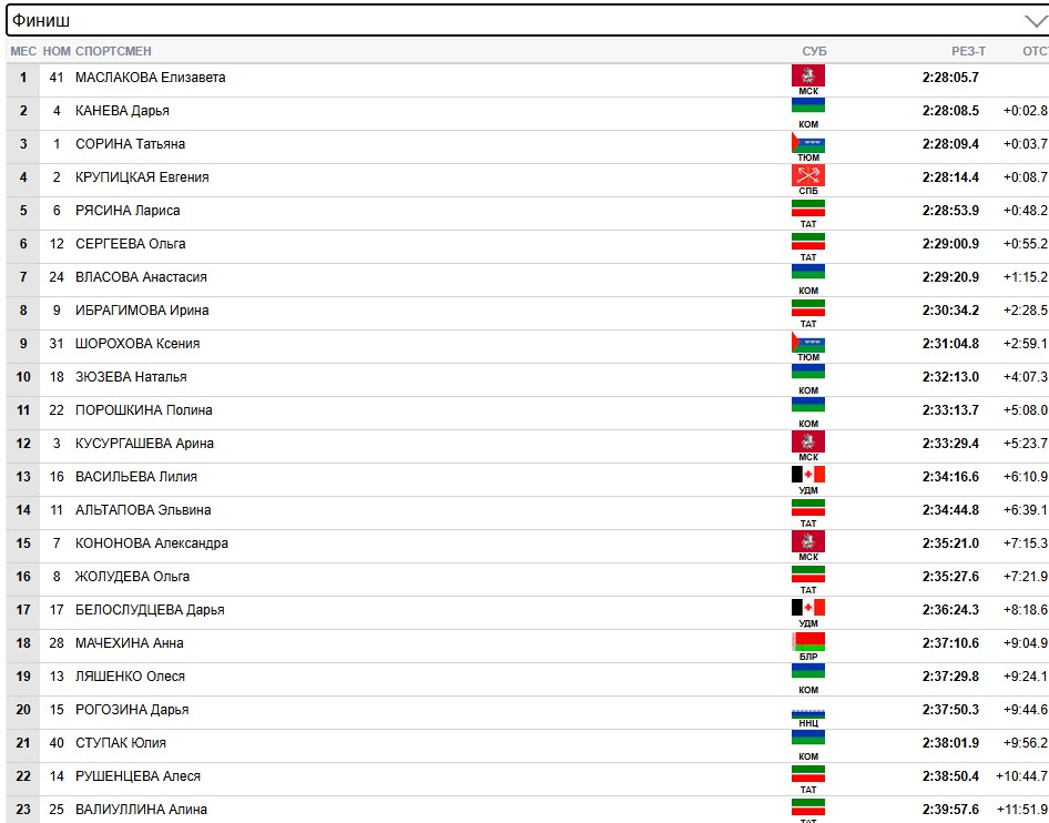 На финише Маслакова уходит от Сориной, а Крупицкая отстаёт.