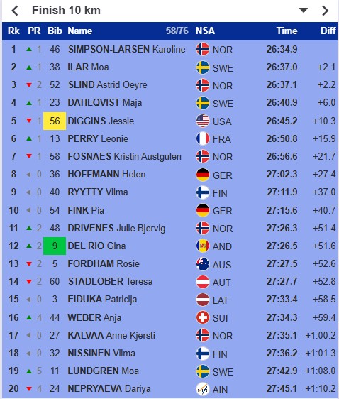 Пятой финишировала Джессика Диггинс, седьмой - Кристин Фоснес. Они сдвинули Непряеву на 20-е место. Гонка завершена.
