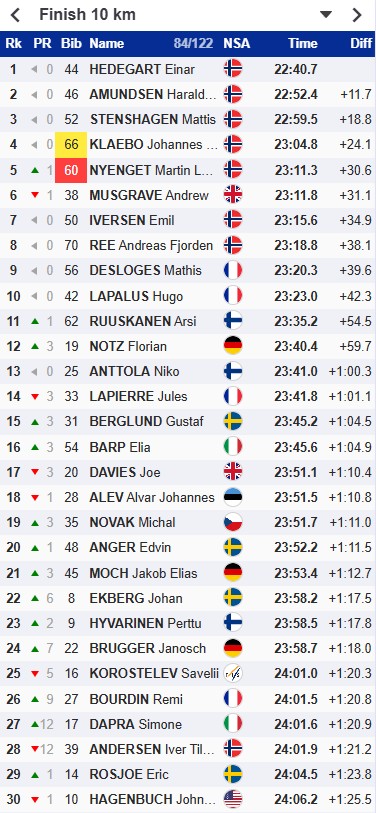 И даже Джо Дэвис опережает Коростелёва на секунду. И пока ещё не было ни одного норвежца.