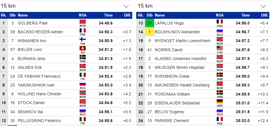 15 километров пройдено, Голберг лидирует, далее Бакшайдер, Нисканен, Биелер и Бурман.