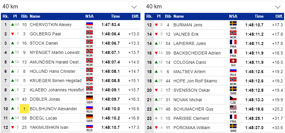 Лучший из россиян пока Якимушкин, на 8 месте. Семиков - 11-й, Большунов - 14-й, Белов -23-й. Мальцев - 25-й, Порошкин - 29-й. 58 человек в группе, она растянуласт на 22 секунды.