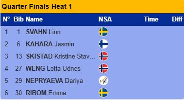 Непряева попала в первый забег с фаворитом, но выбора у неё не было, так как все четвертьфиналы были укомплектованы. В итоге она финишировала последней, а дальше прошли Сван и Шистад.