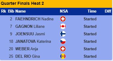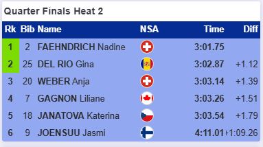Упала Йоэнсуу и одна из фавориток сошла с дистанции. Этим воспользовалась Джина Дель Рио, которая выиграла в финишном створе у Ани Вебер и Лилиан Ганьон. Вместе с Файндрих она прошла в полуфинал.