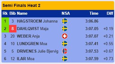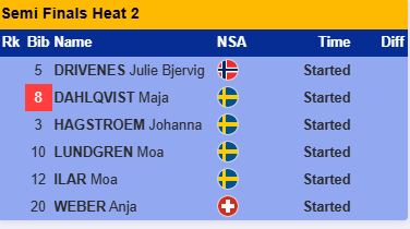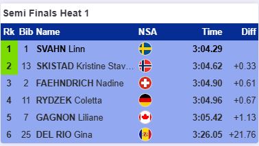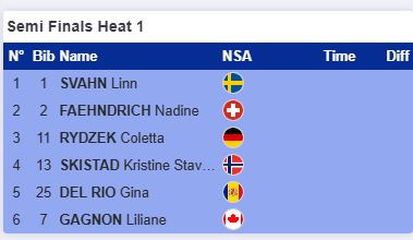 Как и в своём четвертьфинале Сван и Шистад прошли уверенно и не дали шансов другим лыжницам. Файндрих опередила Ридзек в борьбе за третье место.