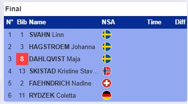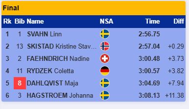 Сегодня не будет полностью шведского пьедестала, как на Олимпиаде. Сван - явный лидер и она подтвердила свой статус, а вот Дальквист и Хегстрём провалились. Только Шистад навязала борьбу Сван, но в итоге заняла второе место.